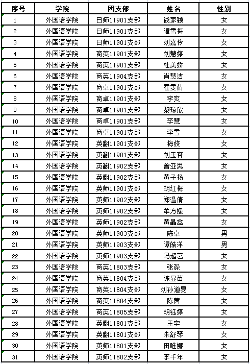根据《共青团推优入党工作实施办法(试行)》(中青发〔2019〕9号)、《共青团长江大学委员会推优工作实施细则》(长大团发〔2017〕8号)文件精神,经各班团支部大会推优投票表决、院团委审核,报外语学院党委审查同意,2021半年团内“推优”“党的发展对象”的同学名单公示如下: