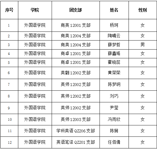 根据《共青团推优入党工作实施办法(试行)》(中青发〔2019〕9号)、《共青团长江大学委员会推优工作实施细则》(长大团发〔2017〕8号)文件精神,经各班团支部大会推优投票表决、院团委审核,报外语学院党委审查同意,2021半年团内“推优”“党的发展对象”的同学名单2020级公示如下: