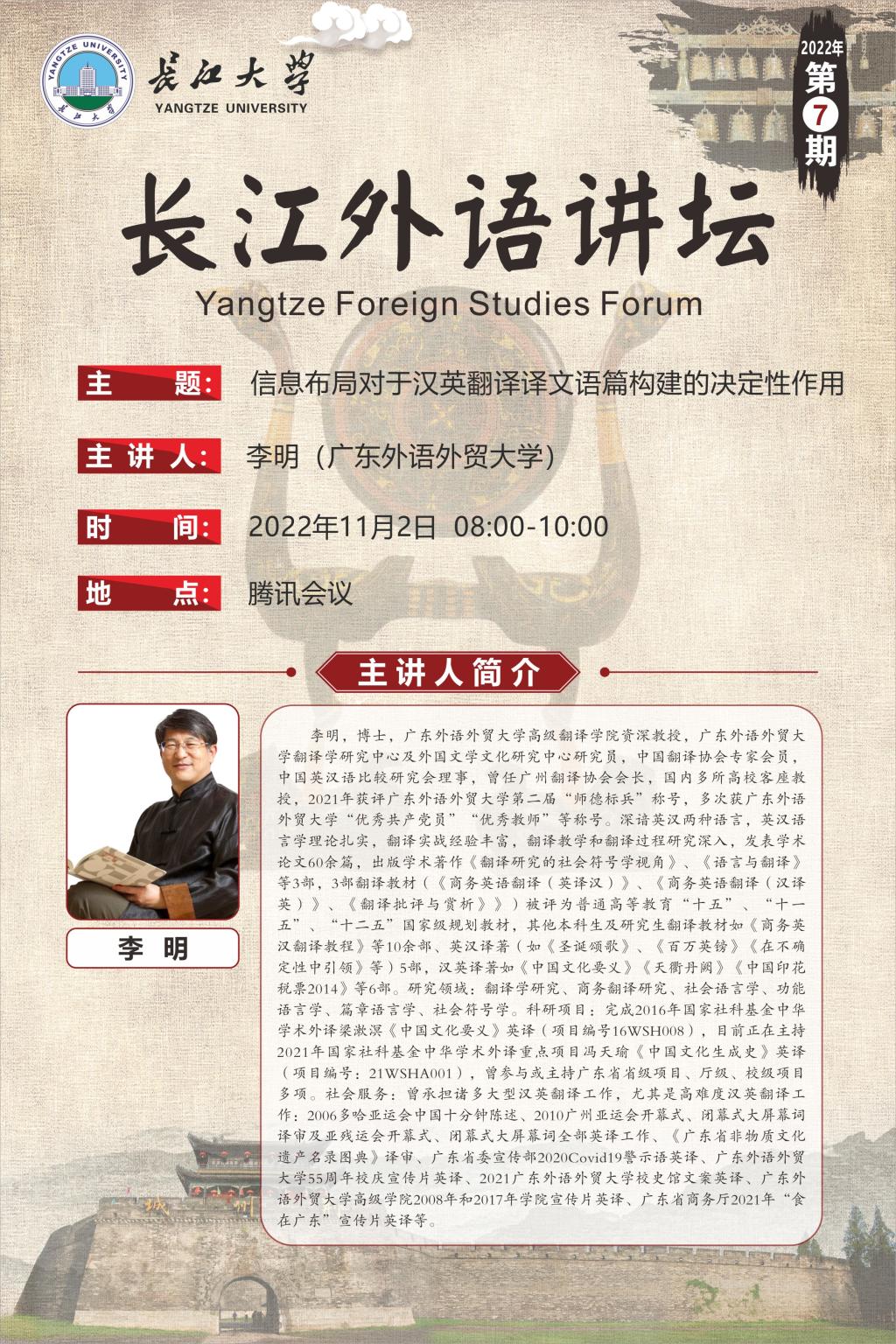 长江外语讲坛(2022年第七讲)信息布局对于汉英翻译译文语篇构建的决定性作用