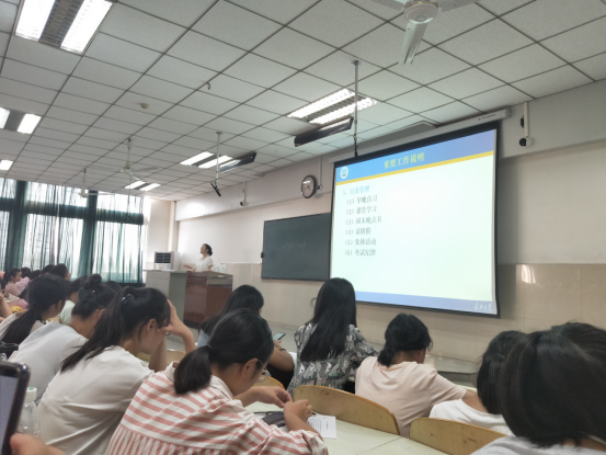 会议接近尾声,薛老师为同学们做重要工作说明,她向同学们说明了新生入学教育测试、军事理论课、户口及档案、家庭经济困难认定、日常学生管理五个重要工作。她提出:“同学们大多已成年,要学会自己解决问题,要注重礼仪礼貌。”