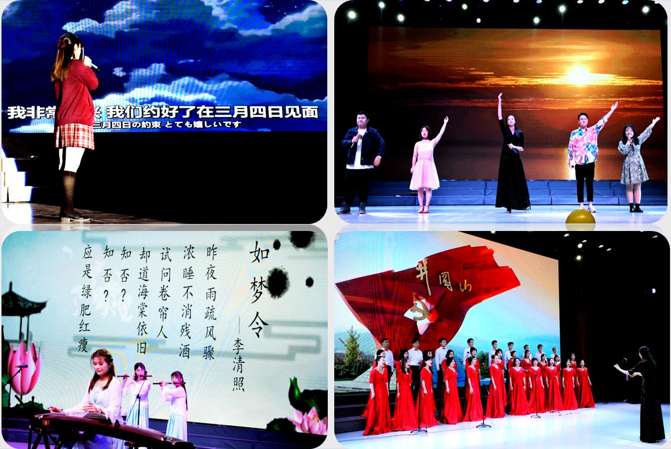 第三篇章“思潮奔涌,红色文化传承,初心使命正担肩”。“阳光号列车”志愿者们以原创的舞台剧《“国家宝藏”之玉覆面》为观众们讲述了一段楚国传奇故事,荆州博物馆的讲解员分别以中英并茂的解说,让大家了解了国宝“玉覆面”的故事,带领大家领略了博大精深的荆楚文化;翩翩伞影,古色古香,悸动旋律,扣人心弦,学生会的学生干部们带来的集体舞蹈《舞动风华》,让所有人深切地感受到阳光外院的活力无限;而悠扬的歌曲《飞云之下》,勾起多少天涯游子的思乡情怀;由学院教职工深情合唱的《我爱你,中国》,表达了我院师生对祖国母亲的深切热爱,将晚会带入到高潮。