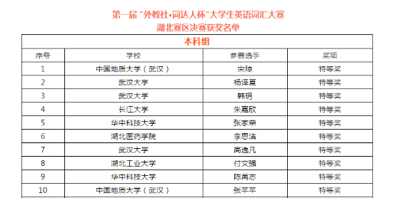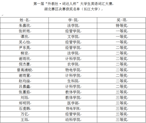 (通讯员:罗博)5月28日晚,第一届“外教社·词达人杯”大学生英语词汇大赛湖北省赛区决赛圆满落幕,我校共有20名非英语专业学生参加决赛,17名同学摘得奖项。法学院法学类31904班的朱嘉欣同学喜获本科组特等奖,3名同学获一等奖,8名同学获二等奖,5名同学获三等奖。我校获奖人数和质量居省属高校前列,长江大学荣获“优秀组织奖”,开云app登录入口李琼华老师被评为“优秀指导老师”。