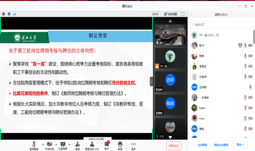 79午,我院通过 腾讯会议”召开了全体教职工音频会议,组织开展了岗位设置与聘用文件解读及工作安排,会议由院长谈宏慧主持。