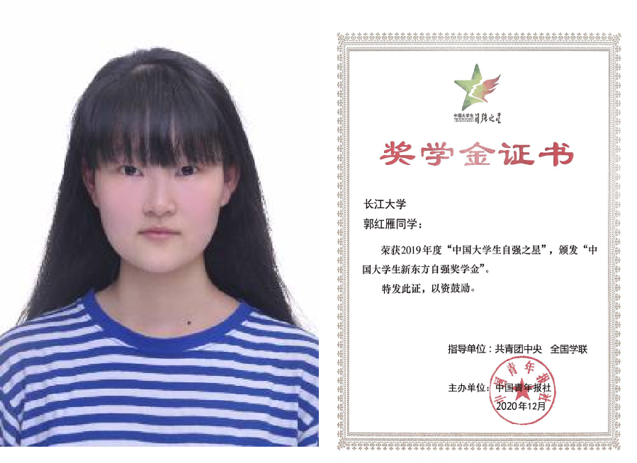 在校期间,她每天早上五点半就起床给妈妈做饭,把妈妈安顿好之后再赶去上学;放学后,她又急匆匆地赶回宿舍,为妈妈做饭、洗衣、按摩,陪妈妈说话,直到晚上才安下心来学习。她用孝心报达母亲,用勤奋书写人生。大学期间,郭红雁同学积极进取,不仅学习成绩优异,而且政治品德优良,先后被评为“荆州好人”、“长江大学十佳明星”、“湖北省向上向善好青年”、“湖北省大学生自强之星标兵”等荣誉称号,多次荣获“国家励志奖学金”、“长江大学奖学金”。2020年6月8日,她光荣地加入中国共产党,在鲜艳的党旗下向党作出了庄严承诺。