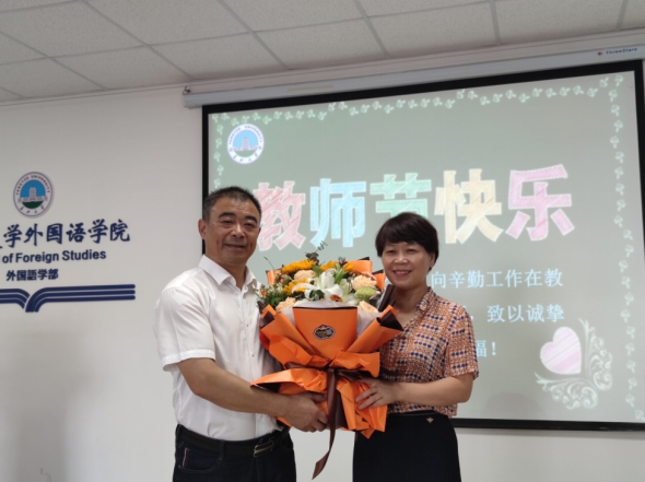 在文科楼712会议室,周从标副校长为我院从教30年教师代表谈宏慧教授、2021年“任大龙奖教金”获得者樊辉老师献上了鲜花,并送上节日的祝福。