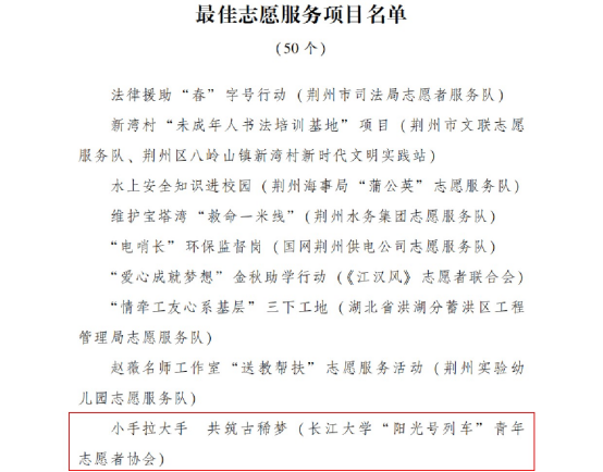 (通讯员:车桥)在“3.5学雷锋日”来临之际,中共荆州市委精神文明建设指导委员会办公室下发了《关于2020-2021年度荆州市学雷锋志愿服务先进典型的通报》,我校“阳光号列车”青年愿者协会报送的“小手拉大手,共筑古稀梦”被评为最佳志愿服务项目。
