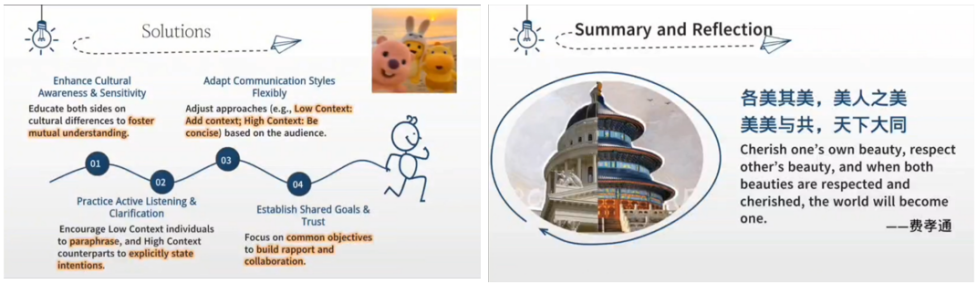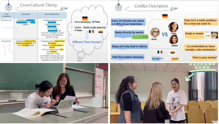 这些表演不仅幽默风趣,更引发了大家对文化差异的深入思考。在分析环节,同学们结合高低语境理论、文化维度理论等,从多角度解读冲突背后的文化根源,并提出了化解矛盾的建议。