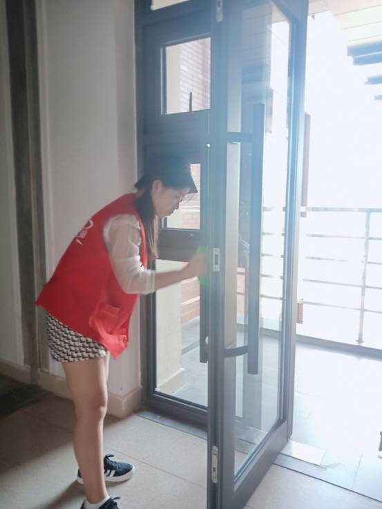 志愿者们从一楼的外围开始打扫,在文科大楼外面的走廊里,行人不断,而在那停留的是我外院志愿者,在不断的行人中,外院那一抹红最是耀眼,手拿打扫工具,不受外界影响,志愿者们认真投入到自己的活动中。从走廊、过道、楼梯到阳台、玻璃门、洗手台、楼梯扶手,每一处角落都没有忽略。爱创自强社的成员带着志愿者们熟悉流程,打扫到了三楼,为了提高效率,志愿者分成两队,一队从四楼开始清洁,另一队从11楼开始清洁,最后一起到七楼外语学院汇合。
