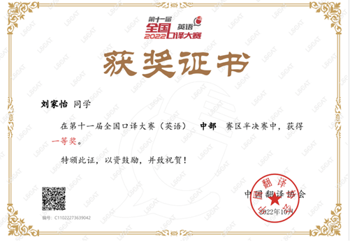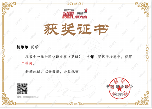 (通讯员 赵宇杰)日前,由中国外文局指导、中国翻译协会主办的第十一届全国口译大赛(英语)交传半决赛落下帷幕。开云app登录入口英语笔译QZ211班研究生刘家怡、杨维维2名同学分别获得中部赛区一等奖和二等奖。其中,刘家怡获晋级全国总决赛交传赛资格。