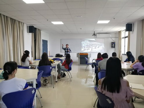 以“我们心中的公共演讲是什么?”引入主题,罗博老师带领选手们一同思考。他从问题类型、提问角度、准备工作和注意事项几方面帮助同学们解决评委提问难关。回答提问时第一,切记仔细听题,倘若有没听清楚或者没听懂,一定不要急着随意作答。通过沟通交流或礼貌提问再次确认问题也是可行的。第二,回答问题时直截了当。给出明确的答案,同时需注意条理,整个回答要完整。尽可能出彩、有深度、有创意。结尾部分可以再次快速简明总结自己的观点,并以短暂停顿加Thank you结束回答,不建议使用That's all。准备工作中,定稿后要逐字逐句地进行推敲、斟酌、梳理找出可能出现的问题,注意逻辑性;并且对选取的例子和个案进行纵深调研,对所选的人物和故事做深入研究;平时训练中多与老师和同学们进行头脑风暴,多方面征求意见,多角度多层次思考问题;回答问题时最好与自身经历紧密结合;反复训练定题演讲和问答环节,逐步完善。最后通过观看去年亚、季军比赛视频,具体分析其选手的优缺点,同学们汲取经验教训。