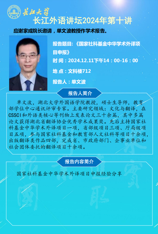 长江外语讲坛2024年第十讲:国家社科基金中华学术外译项目申报