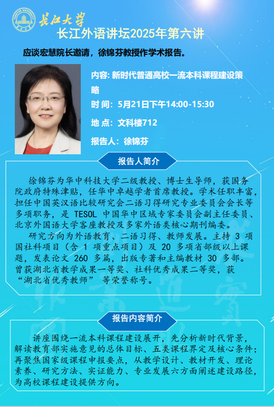 长江外语讲坛2025年第六讲:新时代普通高校一流本科课程建设策略