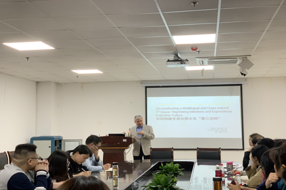 简小滨教授以共同构建多语言跨文化“第三空间”对“异同”的迷思揭开了讲座的序幕。紧接着对强势文化和弱势文化进行解读,他指出两者均是对比文化异同构筑对方为“他者”。并向大家推荐了两位著名的学者,雷蒙潘尼卡和弗朗西朱莉安。他指出“第三空间”需要培养共同的经历,确定共同的利益,协商共同的意图。从单语的到多语的第三空间,需要避免单一方面的意见,也需要避免多语声音。从信息的理解到人设的设置,关于信息的解读受到信息传递者人设认知的条件限制。
